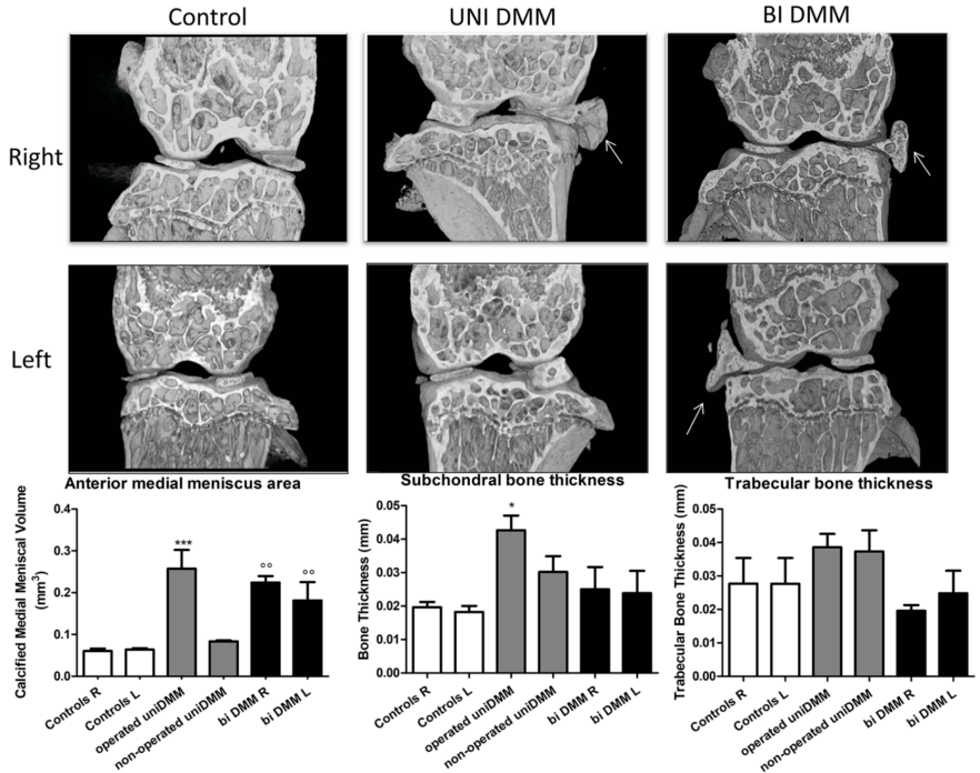 半月板扰动诱导的骨性关节炎模型分别展示假手术组、右单侧和双侧造模组可视图,量化统计图分别为内侧半月板体积、软骨下松骨厚度、软骨下骨厚度。[12]