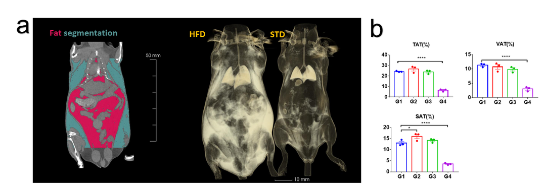 脂肪分割示意图和肥胖小鼠及野生小鼠脂肪3D重建。(a) 红色为内脏脂肪,蓝色为皮下脂肪。重建图显示肥胖小鼠内脏及皮下大量脂肪,野生小鼠几乎无明显脂肪堆积(b)脂肪/体重、皮下脂肪/体重、内脏脂肪/体重质量比,HFD组(G1),STD组(G4)。